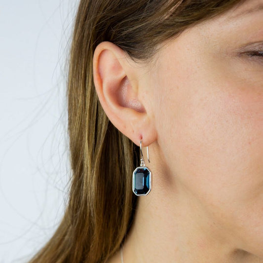 Silver Elongated Octagon Drop Earrings With Montana Blue Crystal E6101L