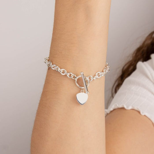 Sterling Silver T-Bar Bracelet With Heart Tag 18cm B122