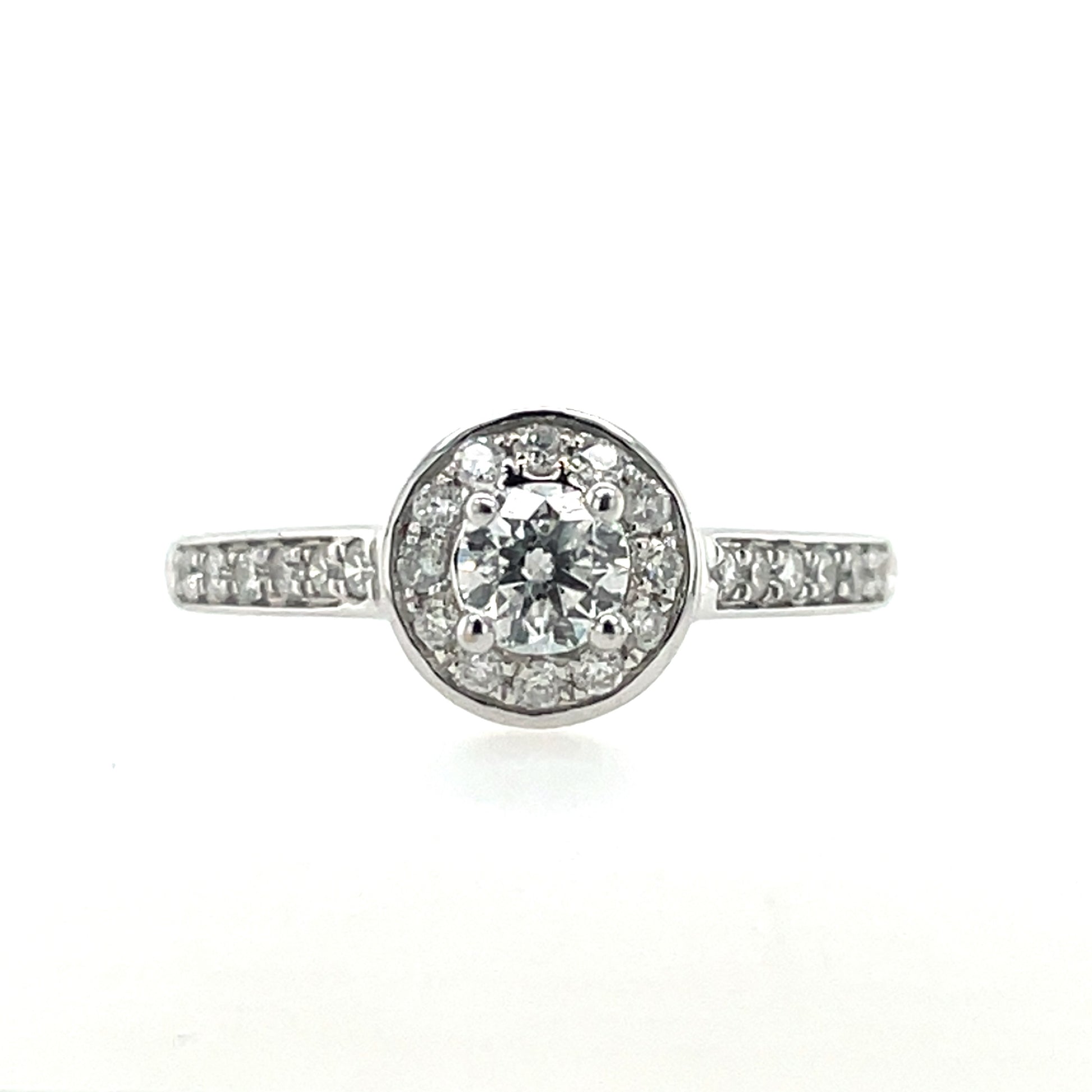 18ct White Gold Diamond 0.60ct Halo Ring with pavé-set shoulders.