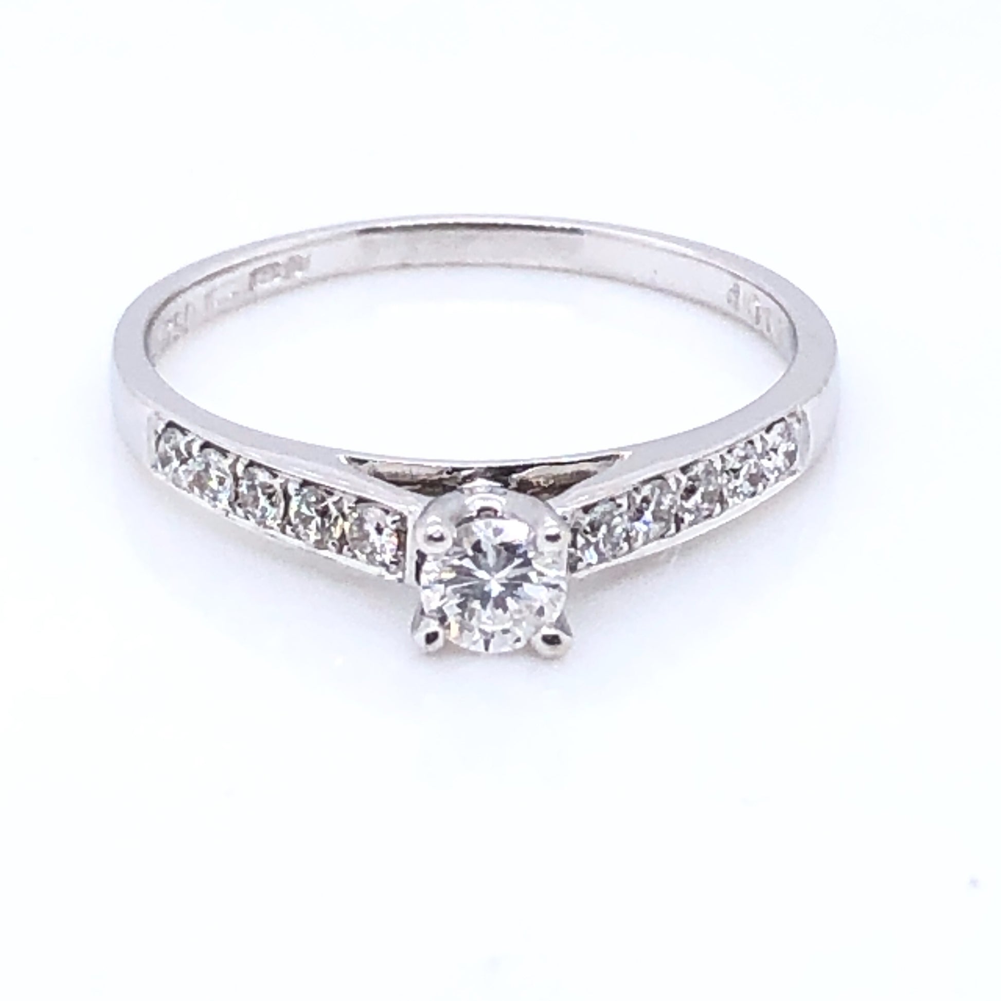 18ct white gold diamond classic solitaire ring, four-claw setting with pavé-set diamond shoulders.