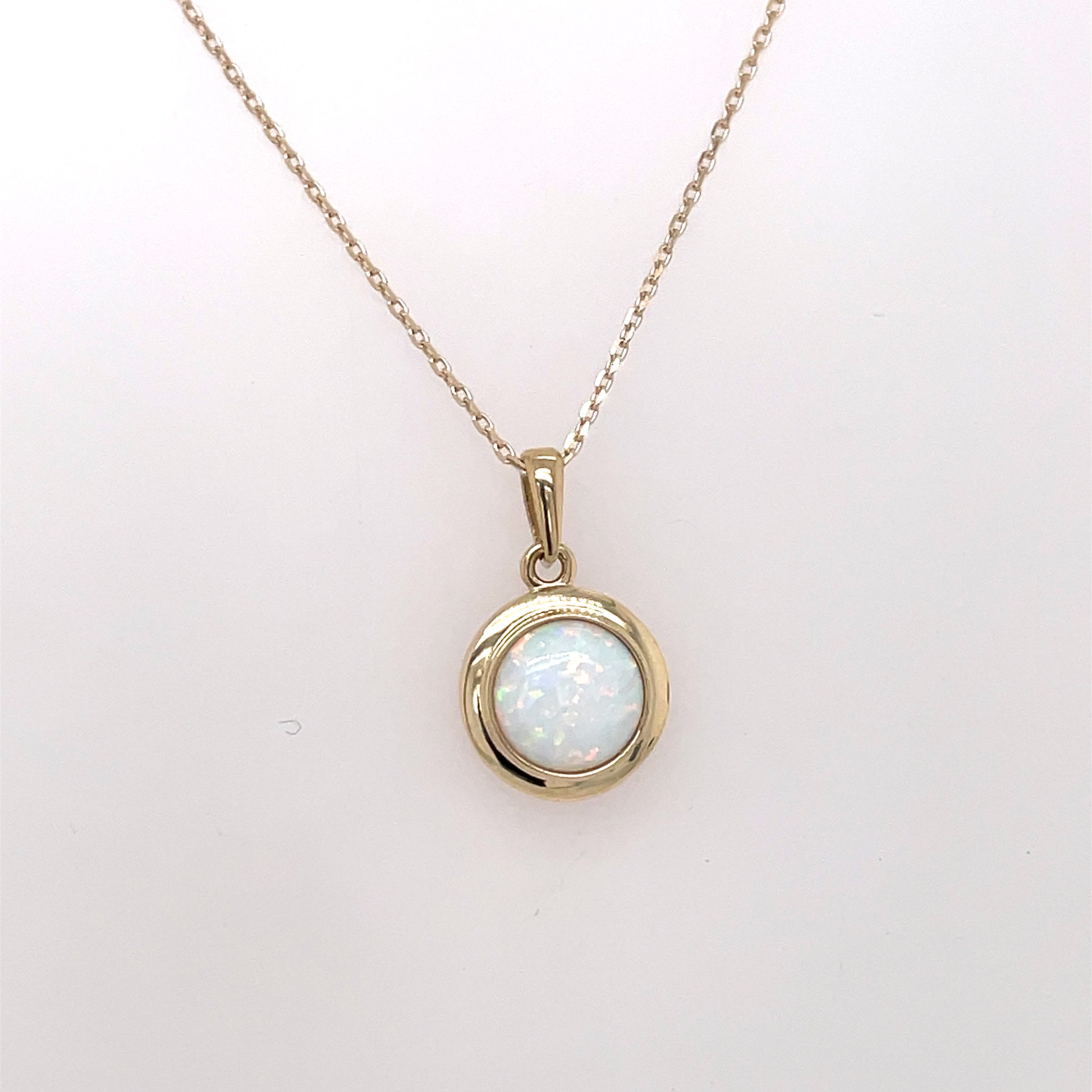 9ct Gold 10mm Round Created White Opal Pendant on 16/18inch chain.