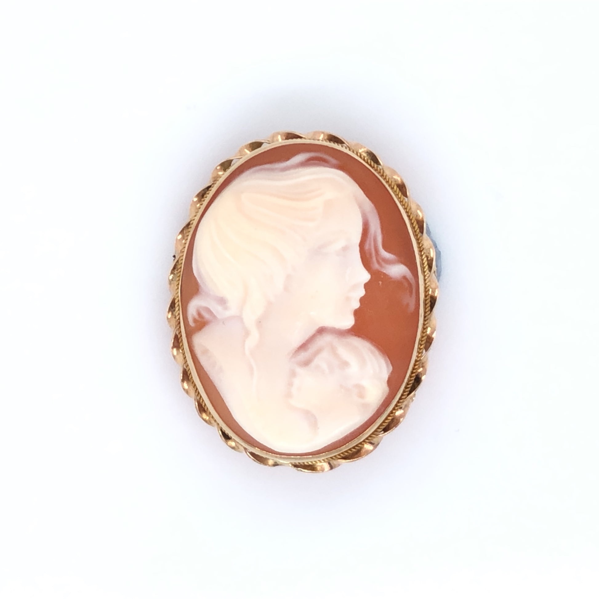 Italian hand-carved Cameo "Mother & Child", set in 9ct gold twisted edge mount.