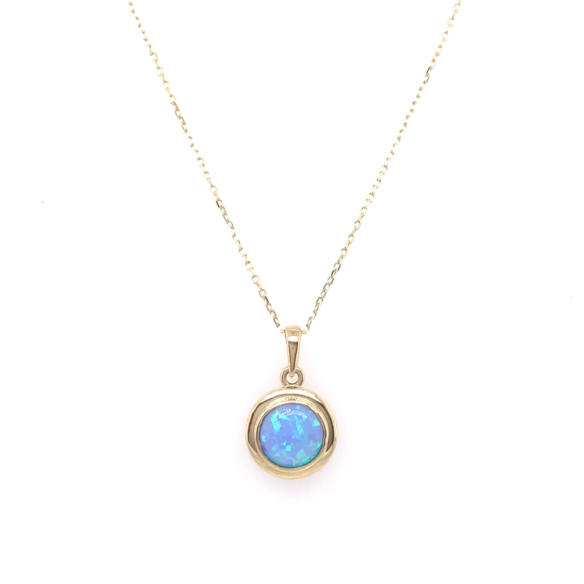 9ct Gold 10mm Round Created Blue Opal Pendant on 16/18inch chain.