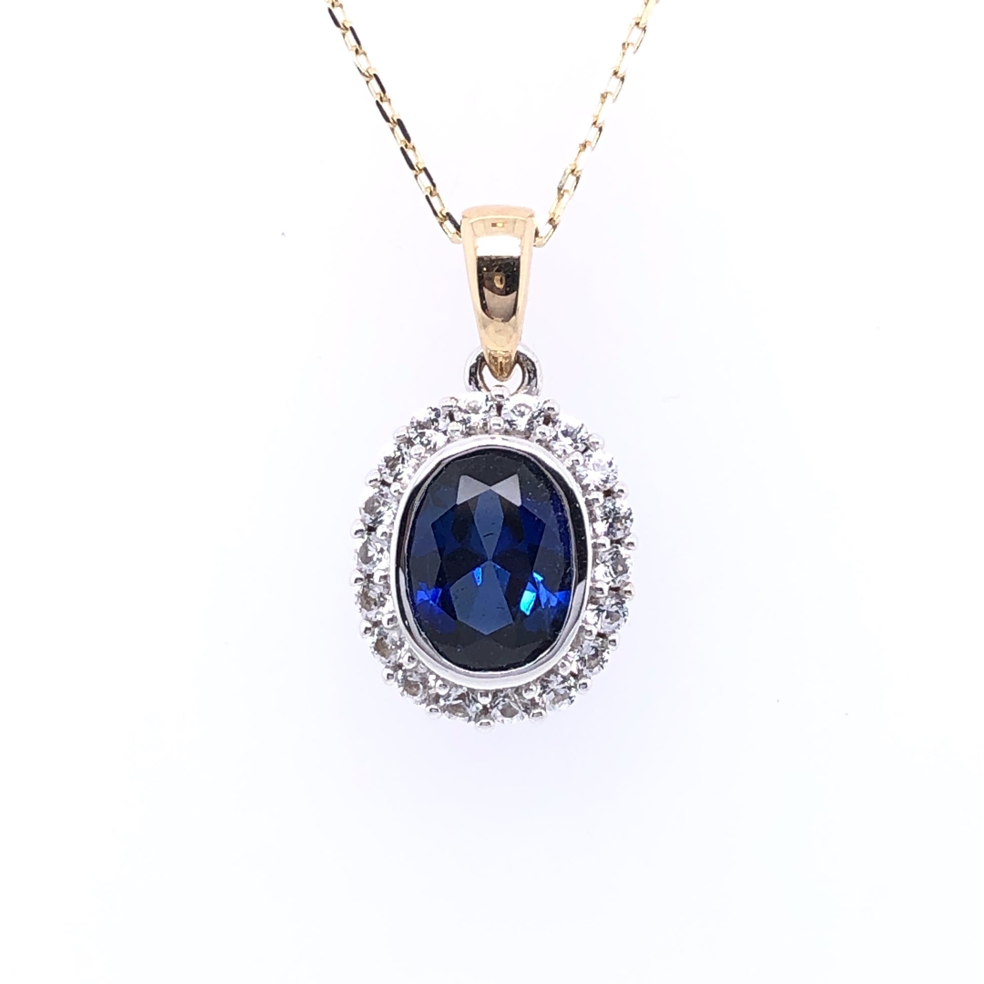 9ct gold created sapphire & white sapphire oval cluster pendant on 18 inch chain