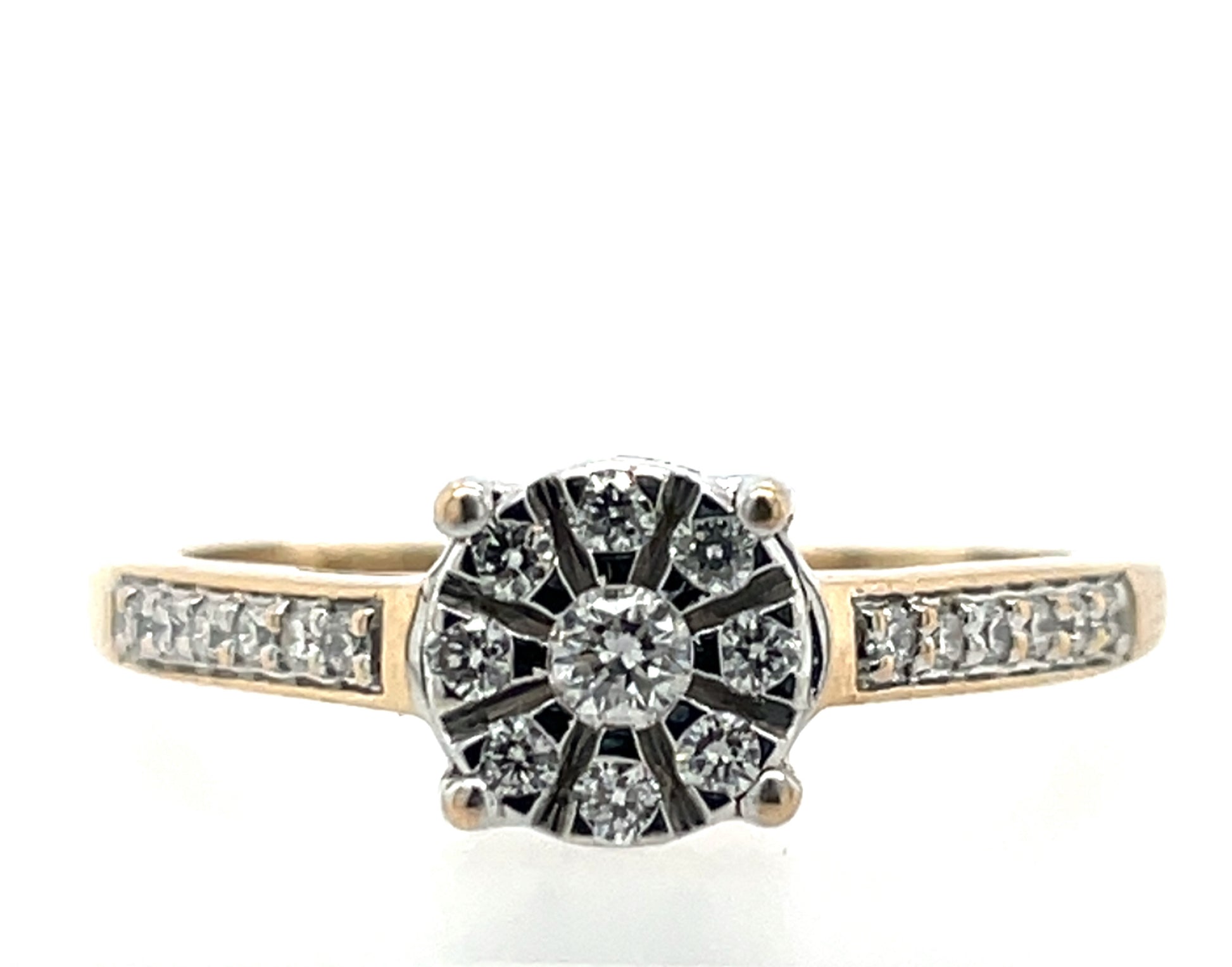 9ct Gold Diamond Illusion Solitaire 0.23ct Ring with pavé-set shoulders.