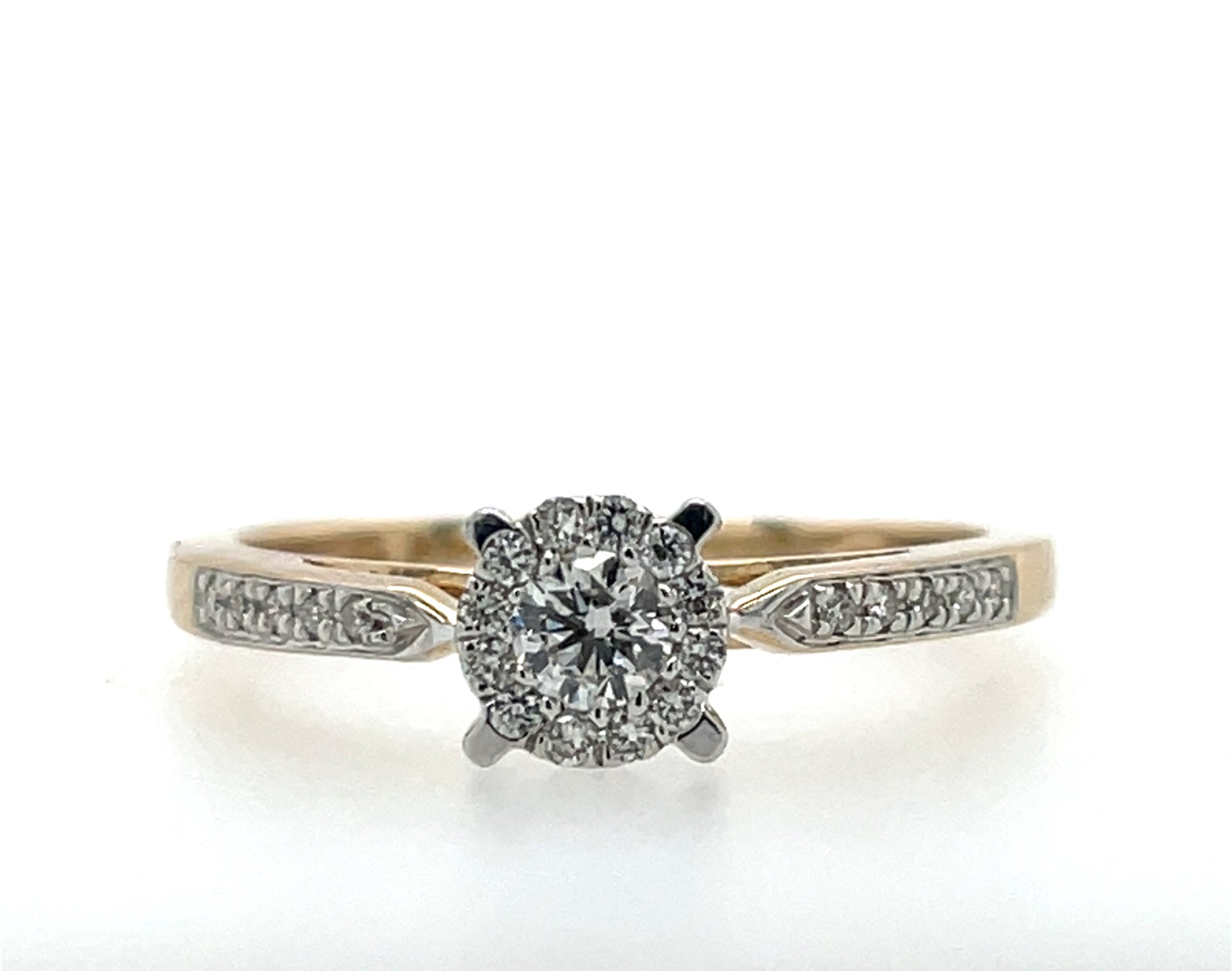 9ct Gold Diamond Illusion Solitaire 0.25ct Ring with pavé-set shoulders.