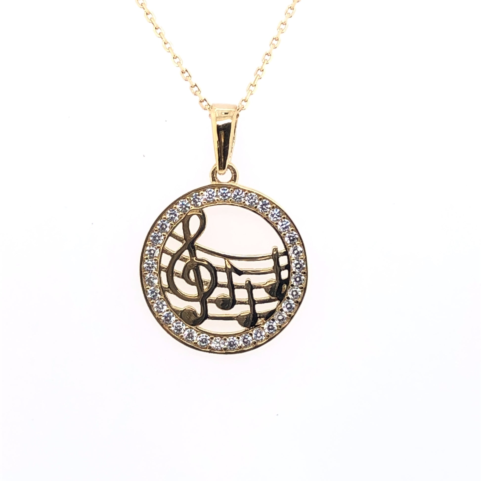 9ct Gold Making Music CZ Circle Pendant on 16/18 inch chain.