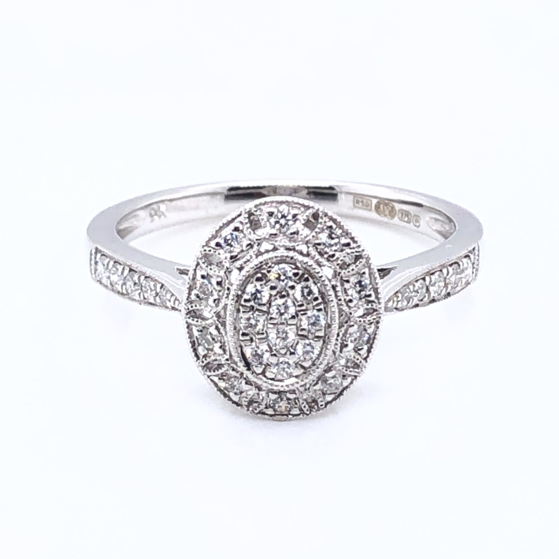 9ct white gold diamond oval deco-style ring with pavé set shoulders.