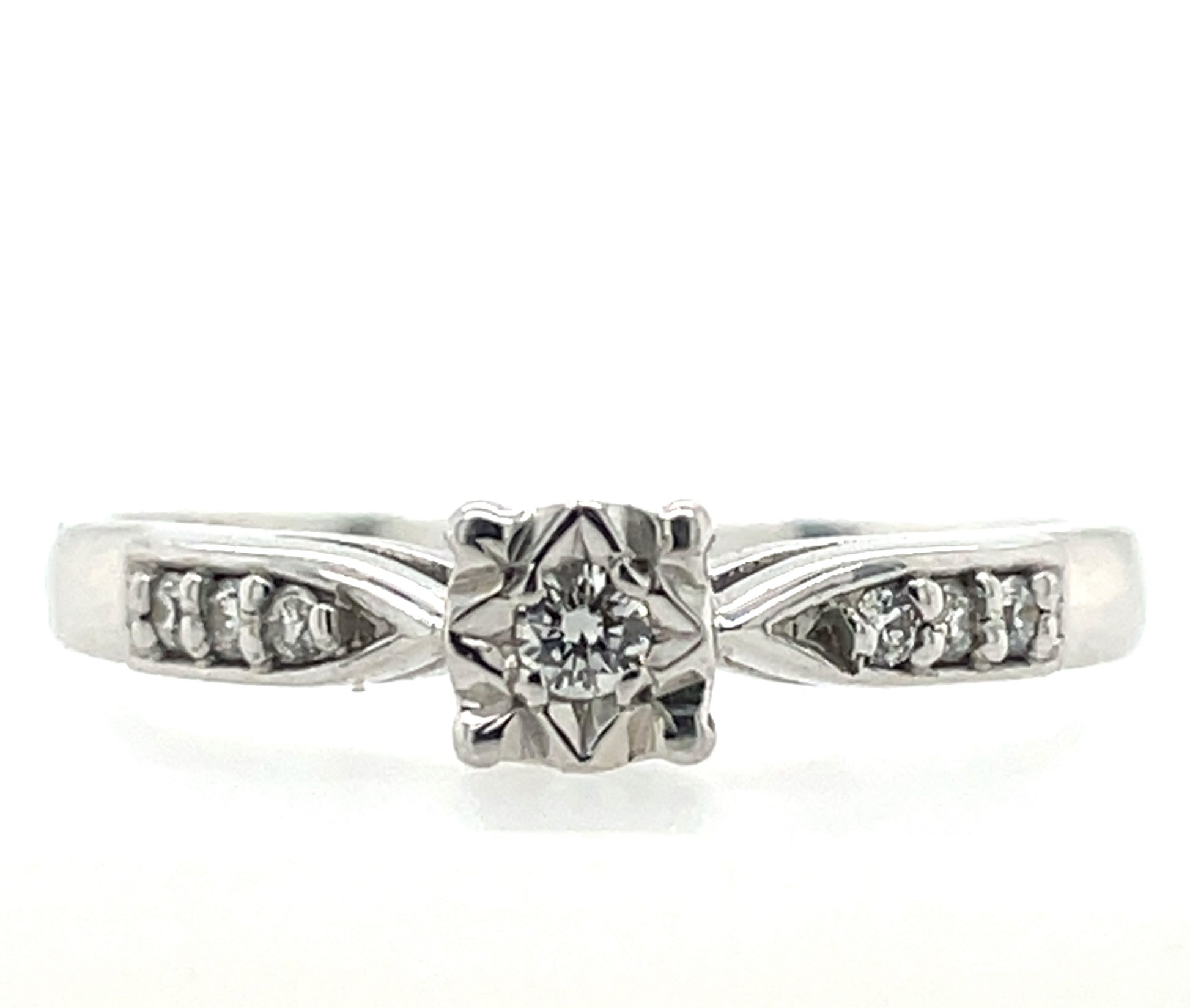 9ct White Gold Diamond Illusion-set Solitaire 0.10ct Engagement Ring, with diamond-set shoulders.