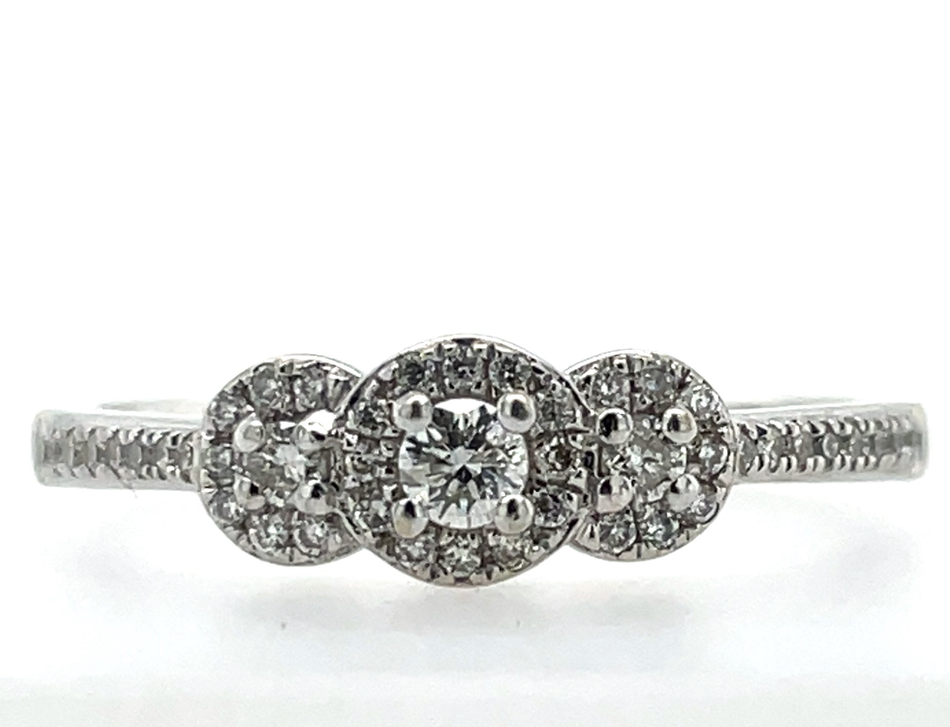 9ct White Gold 0.25ct Diamond Trilogy Halo Ring, diamond-set shoulders.