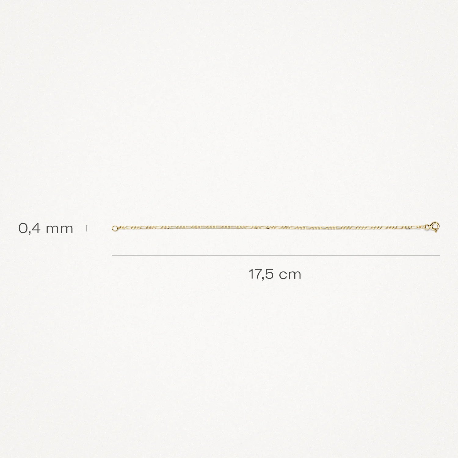 This refined link bracelet, crafted from 14k yellow gold, is a timeless classic. The elegant Figaro link and 17.5 cm length ensure a perfect fit. It's effortless to wear, whether worn alone or layered. A subtle yet stylish addition to your jewellery collection.