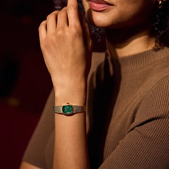 Step back in time to the glitz and glam of the 1970s with the Bulova women’s Classic “Goddess of Time” watch. Borrowing the timeless design of vintage Bulova “Goddess of Time” watches, the gold-tone stainless steel tonneau case has a textured top and a brightly polished bezel, seamlessly transitioning to a textured mesh bracelet. Each striated green genuine malachite dial is completely unique and is appointed with gold-tone applied markers and matching hands, while Bulova’s Goddess of Time herself is etched onto the case back in intricate definition. Feel truly divine in this stunning Bulova ladies’ timepiece.