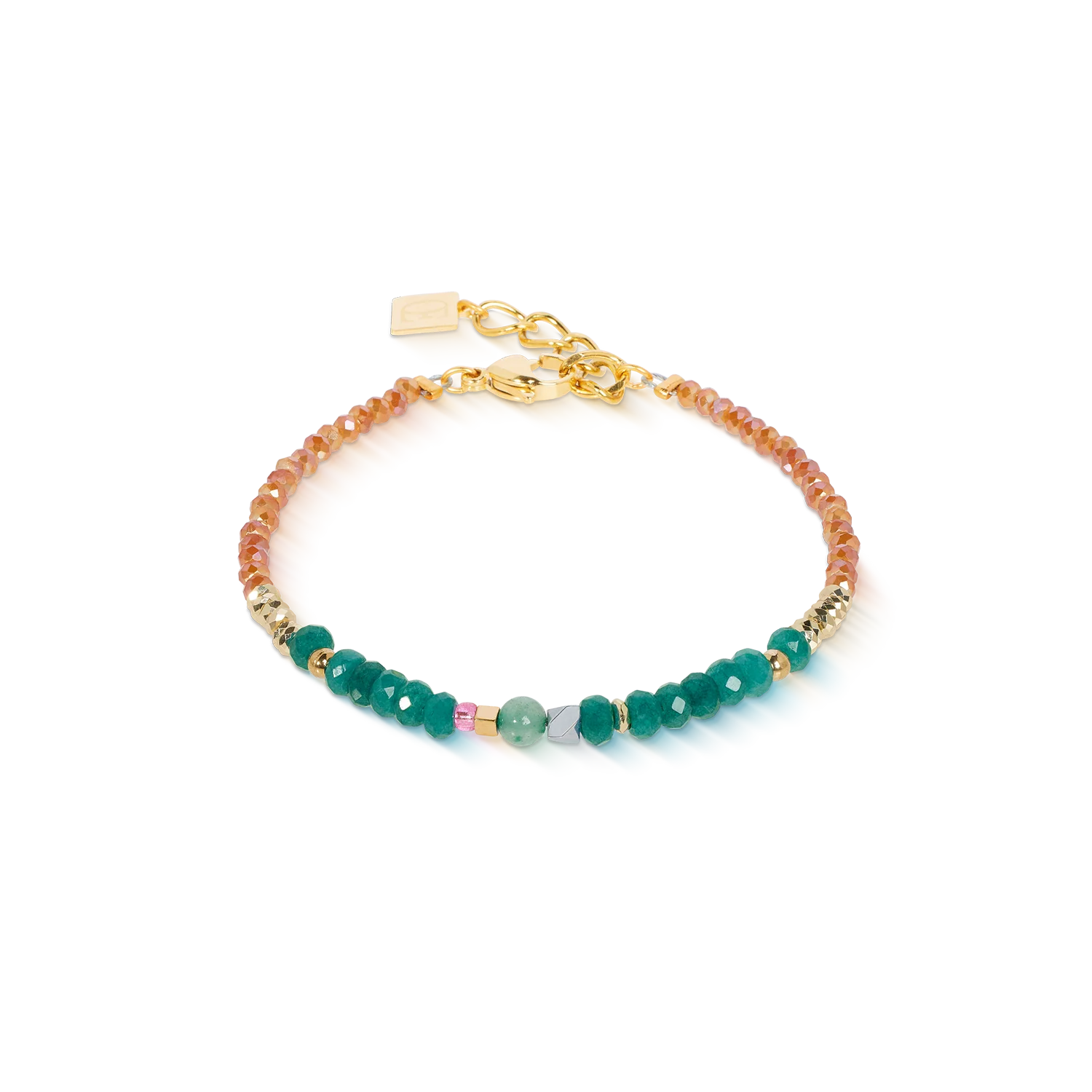 Lots of colour, lots of character - the bracelet picks up on the multifaceted colour world of the matching necklace and brings it into a wearable design for every day. With aventurine, coloured jade, cut glass and Crystal Pearls by Swarovski®, it combines natural elements with shiny details in gold-look stainless steel. For a harmonious look, the clear shapes can be ideally combined with jewellery from the Essentials Wave Collection.