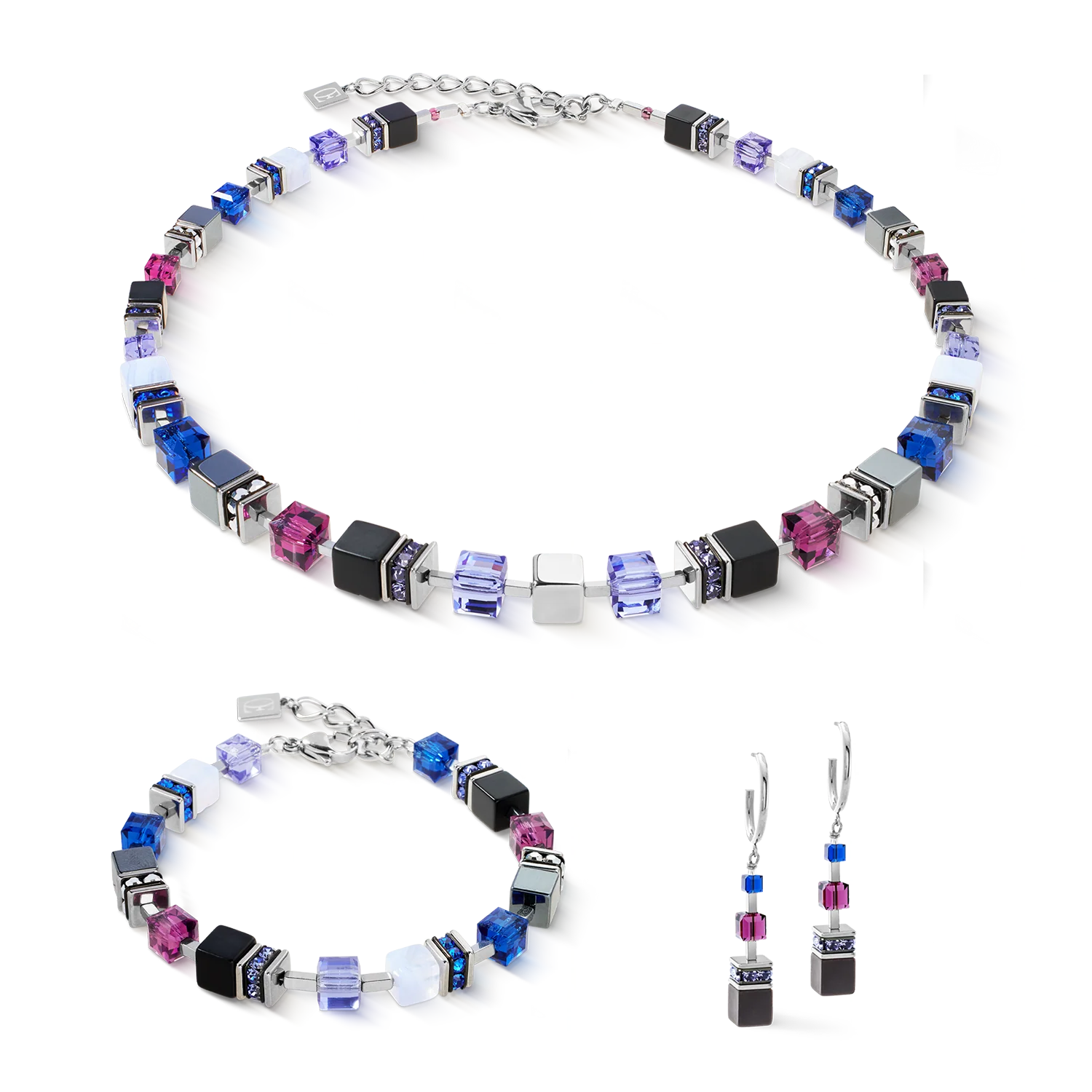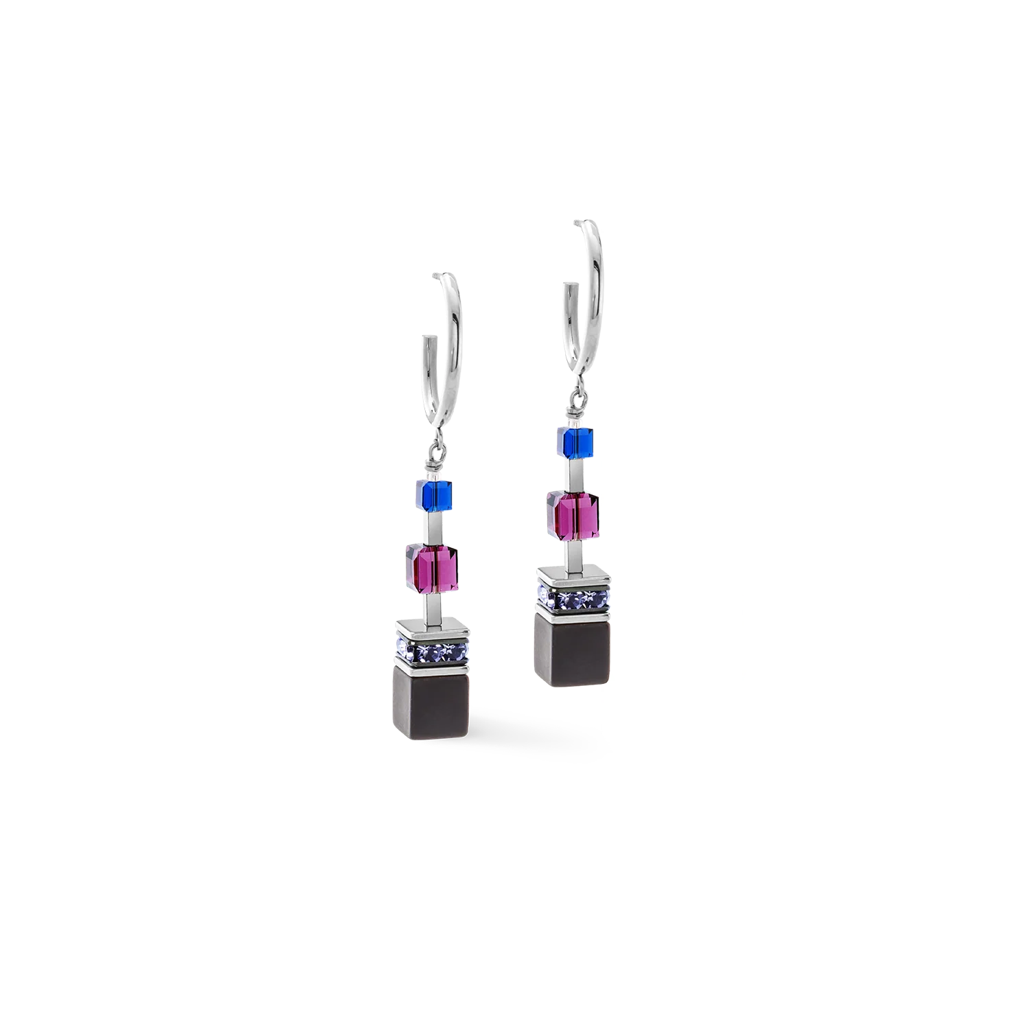 The GeoCUBE® Blue Moon hoop earrings set striking accents with geometric clarity. A black onyx cube forms the base of the pendant, complemented by cube elements in bright pink and vibrant blue. Silver-coloured stainless steel gives the design a modern frame. Expressive and versatile - perfect as a statement, worn solo or as a set.