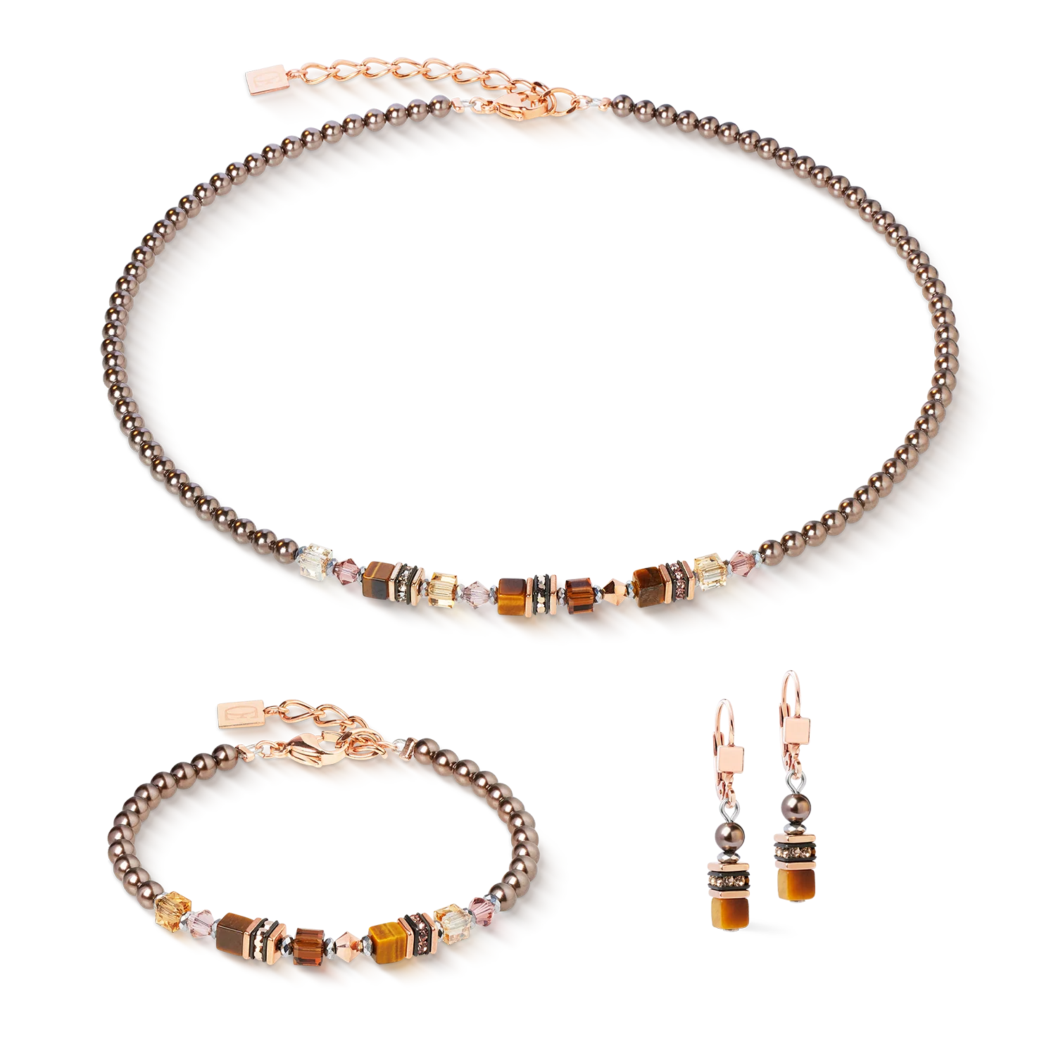 Warm shades of brown, shimmering rose gold and a hint of earth and light - the Princess Earth Glow necklace combines powerful elegance with natural materials. Tiger's eye, precious Swarovski® crystals and softly shining crystal pearls create a harmonious interplay of colours reminiscent of the glow of the evening sun. The design impresses with its sophistication and fine details - perfect to wear as a single piece or as a set.