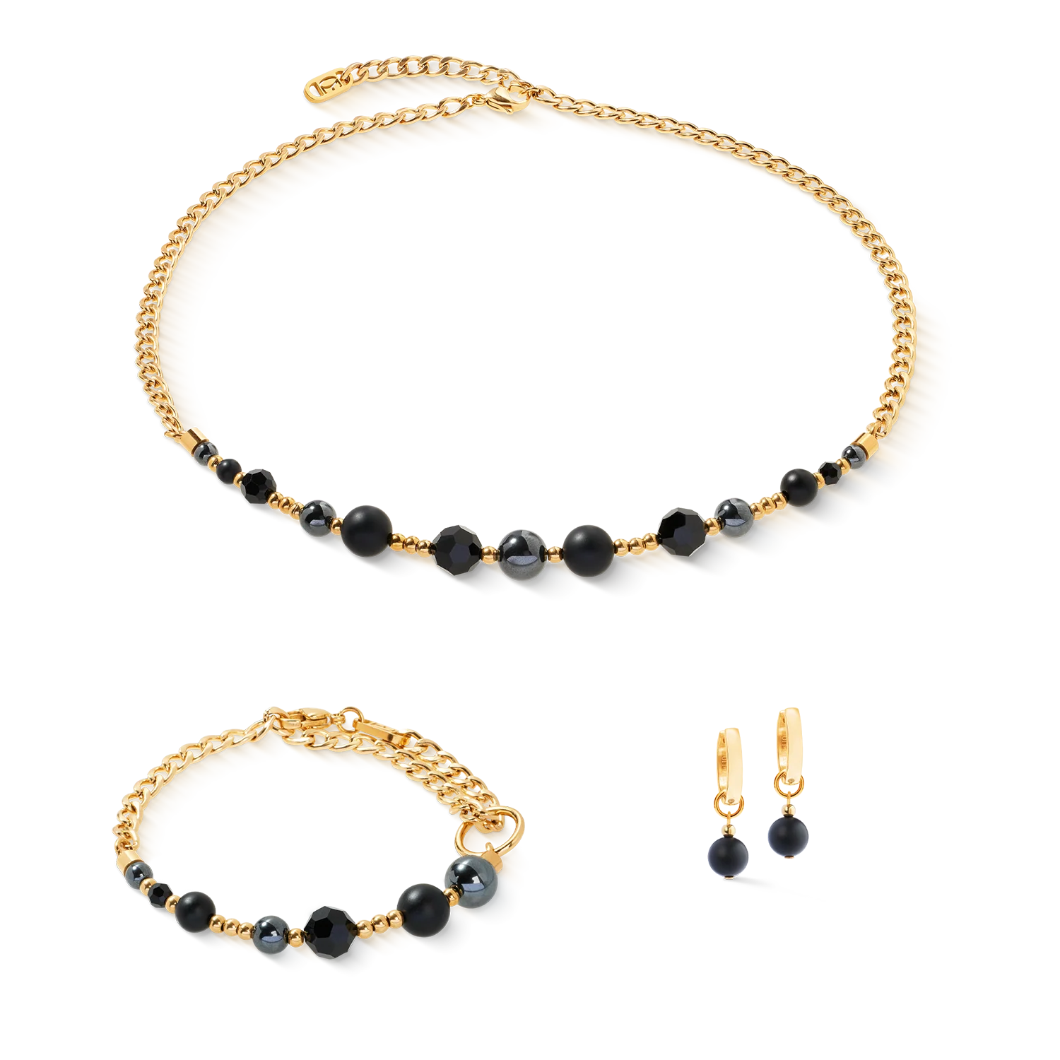 Minimalist design meets precious materials: the Pure Spheres gold-black necklace combines spherical onyx, reflective haematite and sparkling crystals with a stylish link chain made from gold-plated stainless steel. The combination of fine spheres and graphic chain gives the piece of jewellery structure and sophistication - an elegant eye-catcher for day and evening.