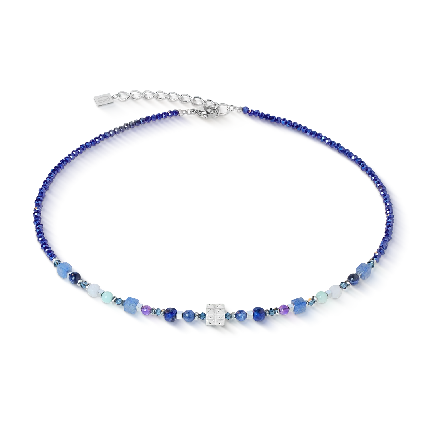 The Shape Mix Spikes Blue Moon necklace combines the fascinating colours of the Blue Moon colour trend with the clear shape of the stainless steel Spikes Cube. Precious natural stones such as lapis lazuli, amazonite, chalcedony, blue aventurine and sodalite meet coloured agate and sparkling Swarovski® crystals. The mysterious Future Dusk colour is particularly intense - a deep blue with a hint of violet that underlines the mysticism of this necklace. As each natural stone has its own pattern, each piece of jewellery is unmistakably unique.