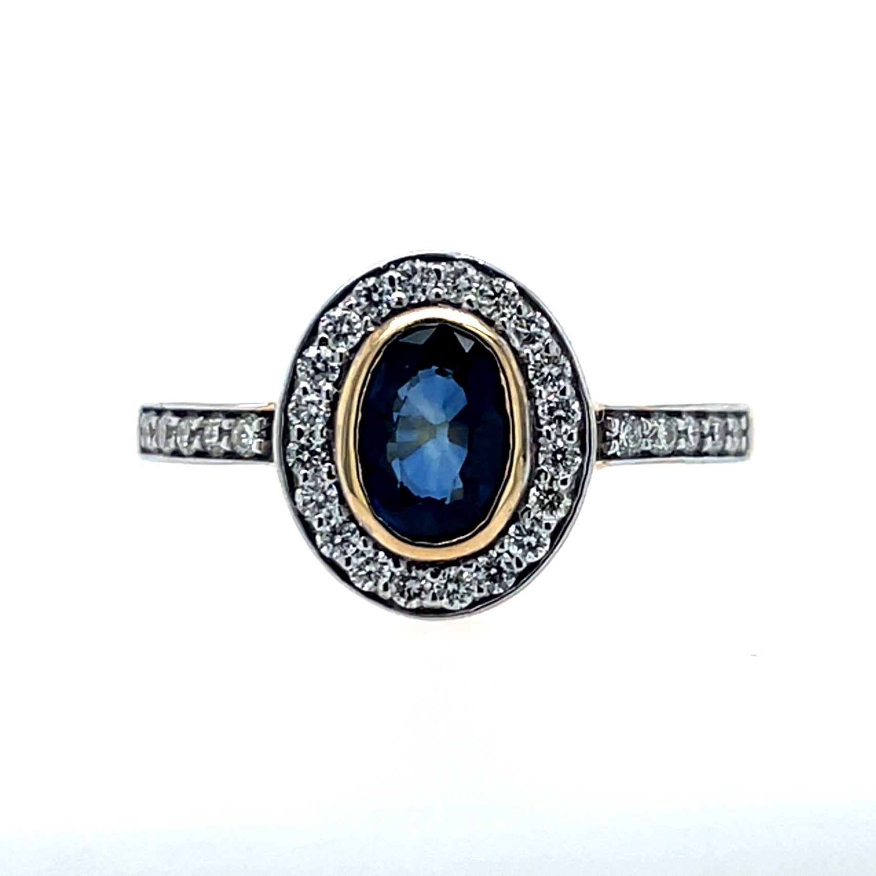 Sapphire 7 x 5mm, 0.95ct, diamonds 0.30ct.