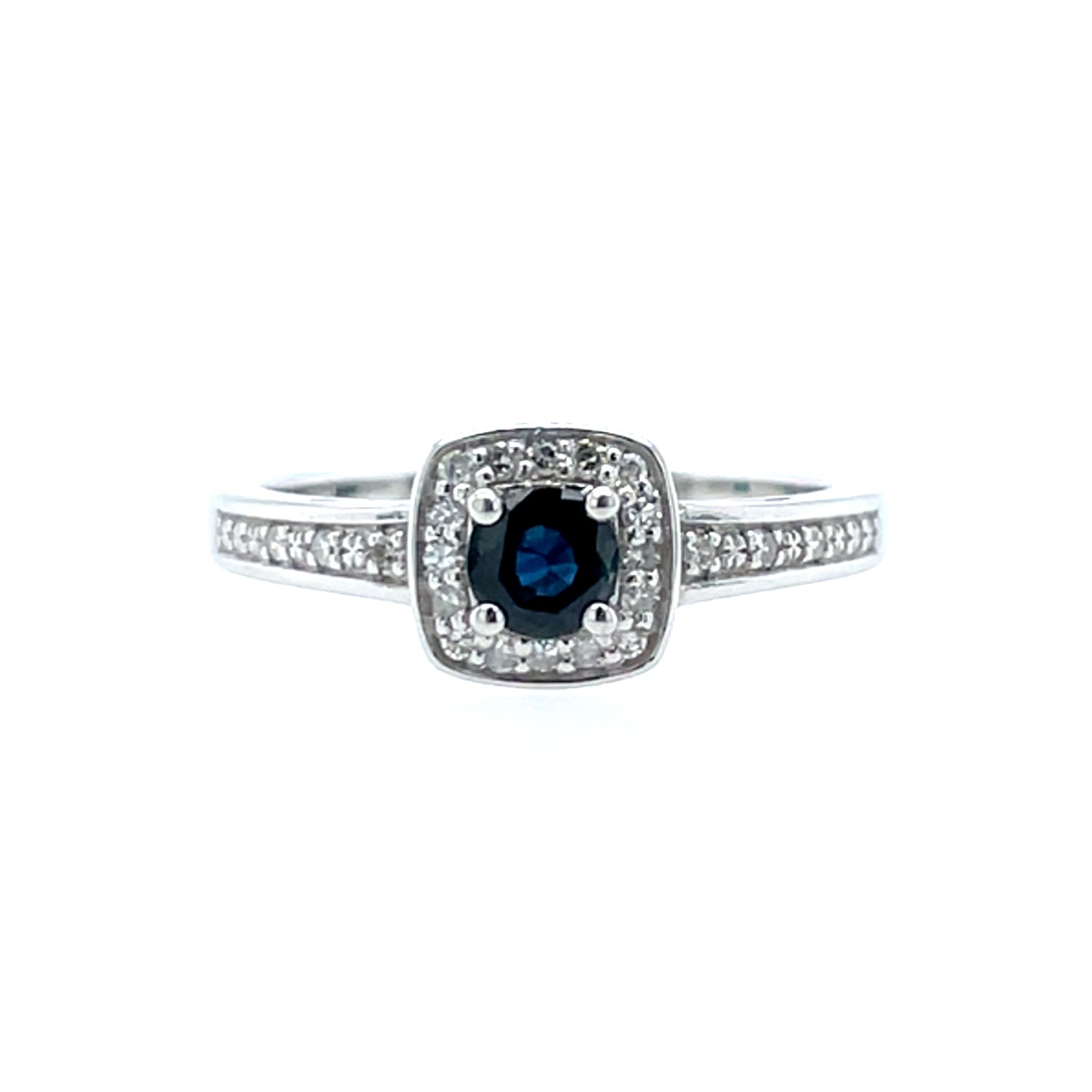 9ct white gold sapphire & diamond cushion cluster ring.