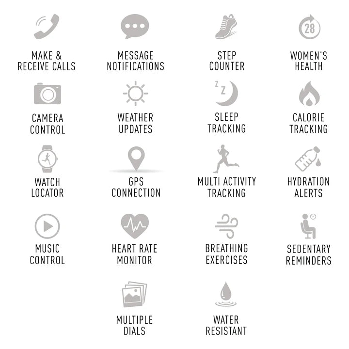 The NEXUS 100 also offers an extensive range of lifestyle & wellness features, including step count, heart rate monitor, blood oxygen, cycle tracking, calories, sleep analysis, multiple sports tracking and more. IP68 water resistant.