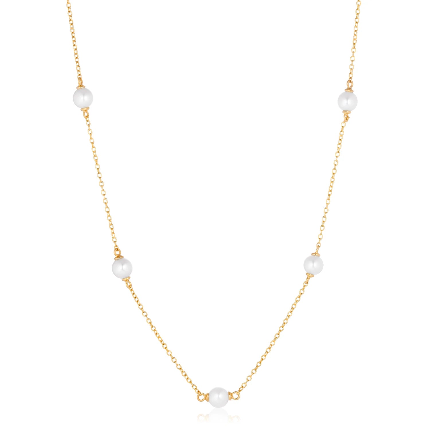 Necklace made of 18 karat gold plated 925 Sterling silver, polished surface, handset with facet cut white zirconia and lustrous freshwater pearl.