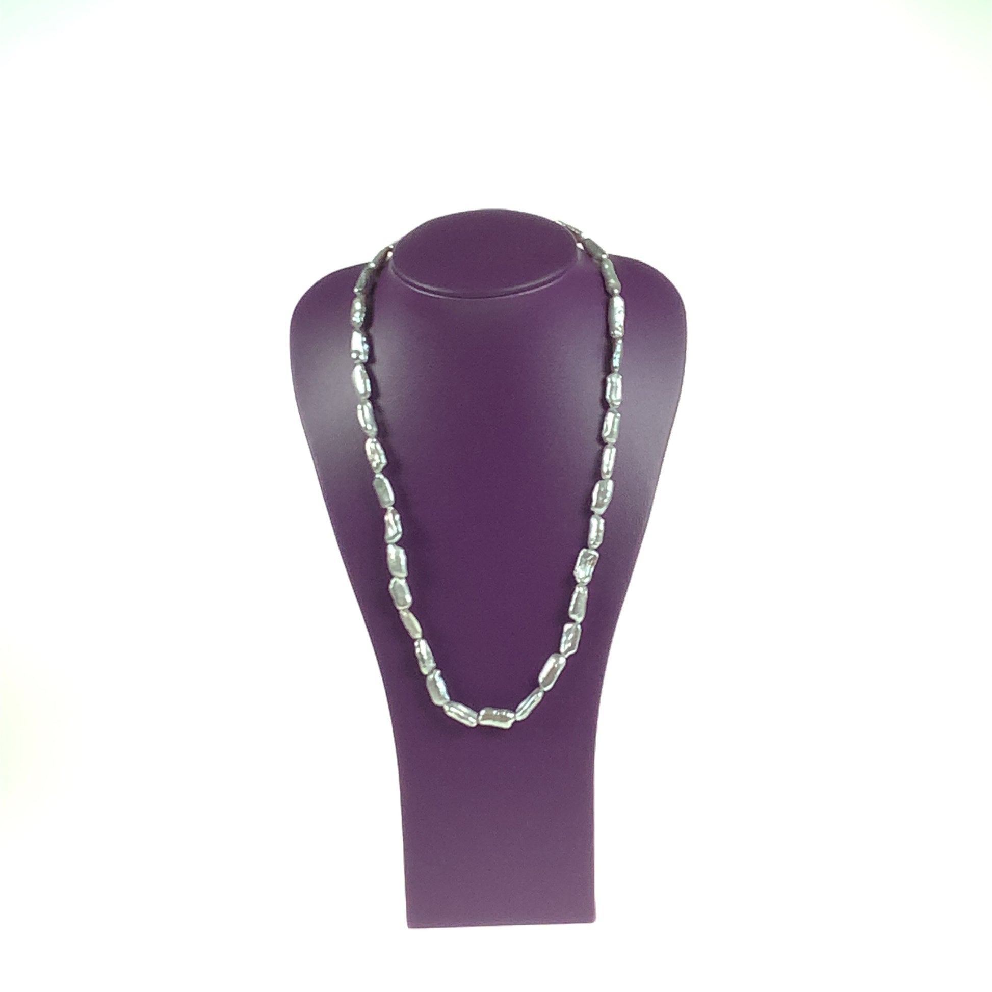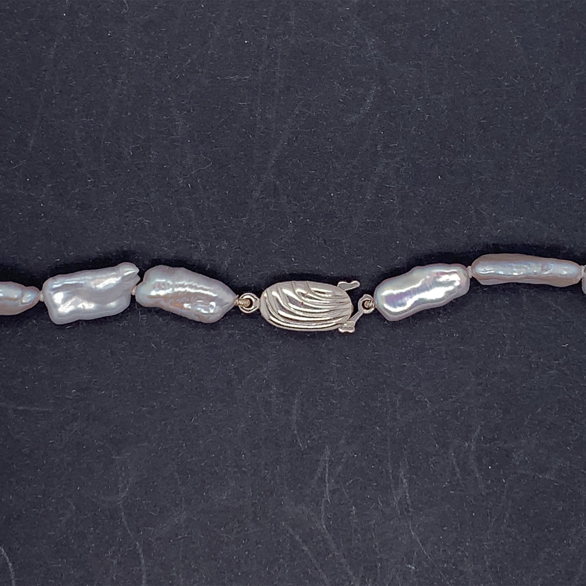 Silver-Grey BIWA Cultured Pearl Necklace, individually knotted with silver shell clasp.
