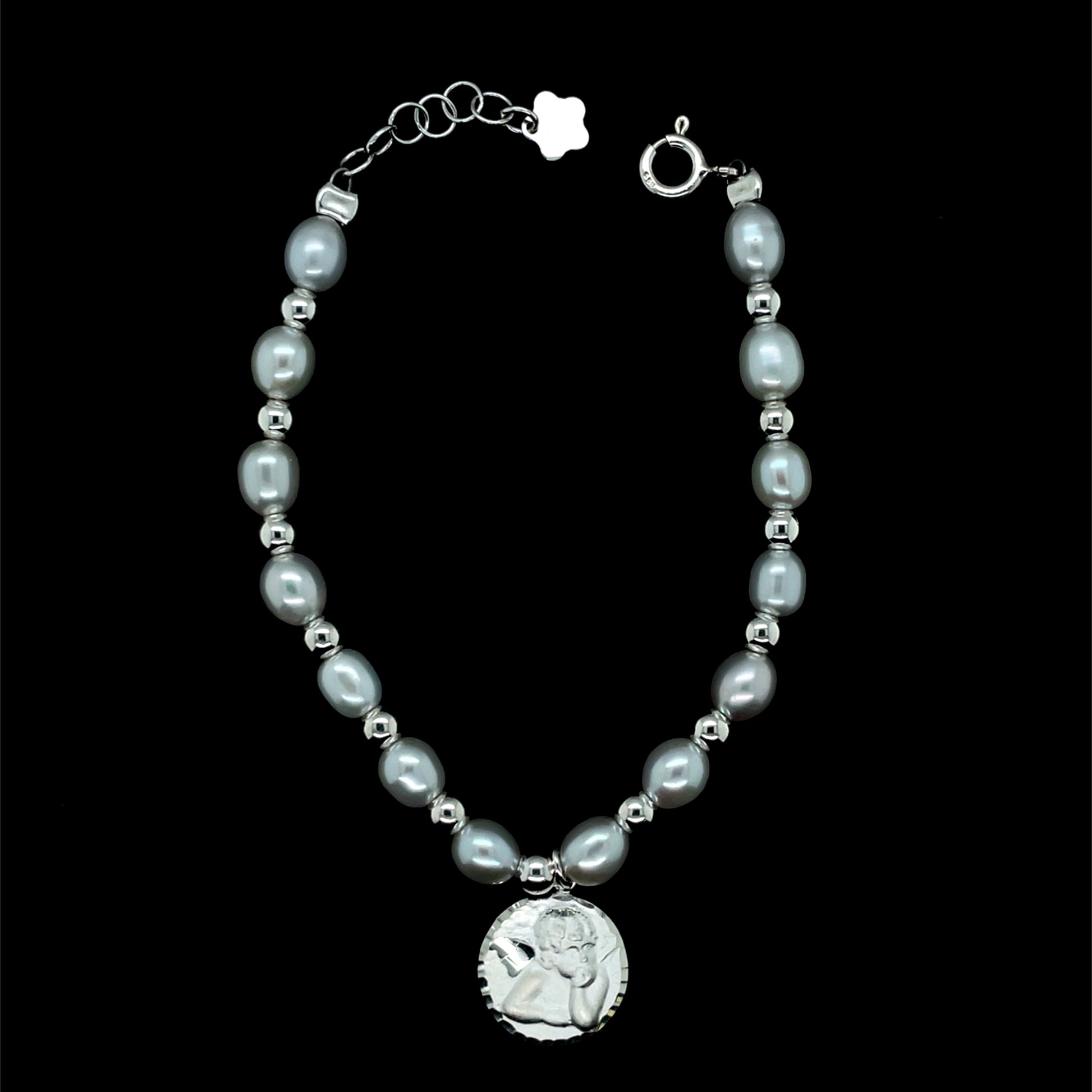 Silver Pearl Bracelet with Angel Disc. Perfect for Commuinion or Flower Girl gift.