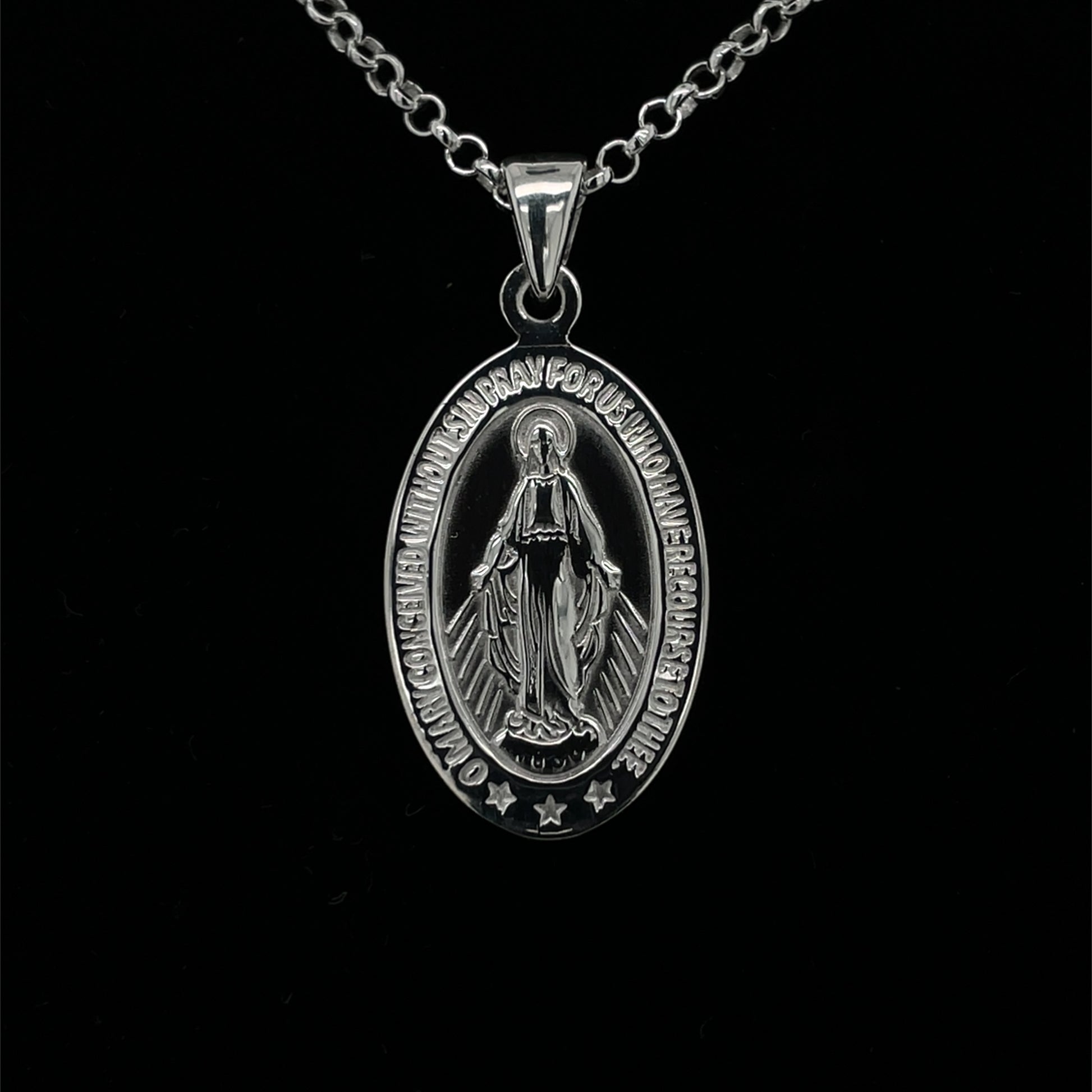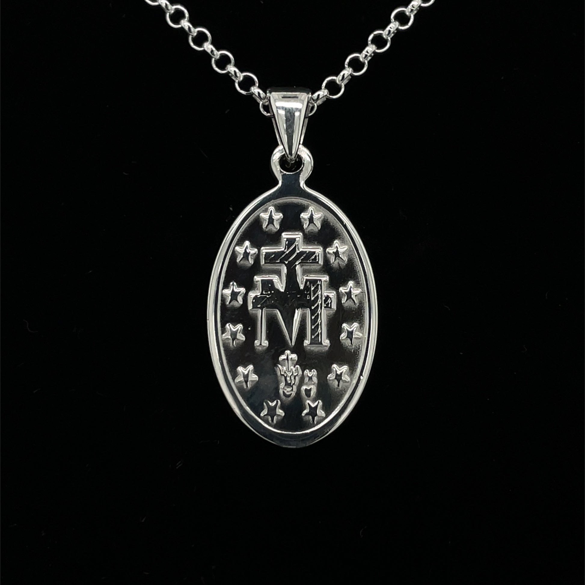 Sterling silver Miraculous Medal on 20 inch chain.