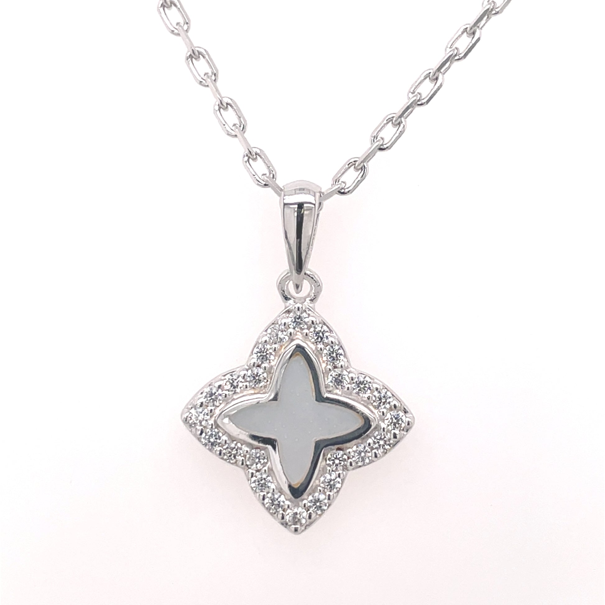 Sterling Silver CZ Mother of Pearl Quatrefoil Pendant on 18 inch chain.