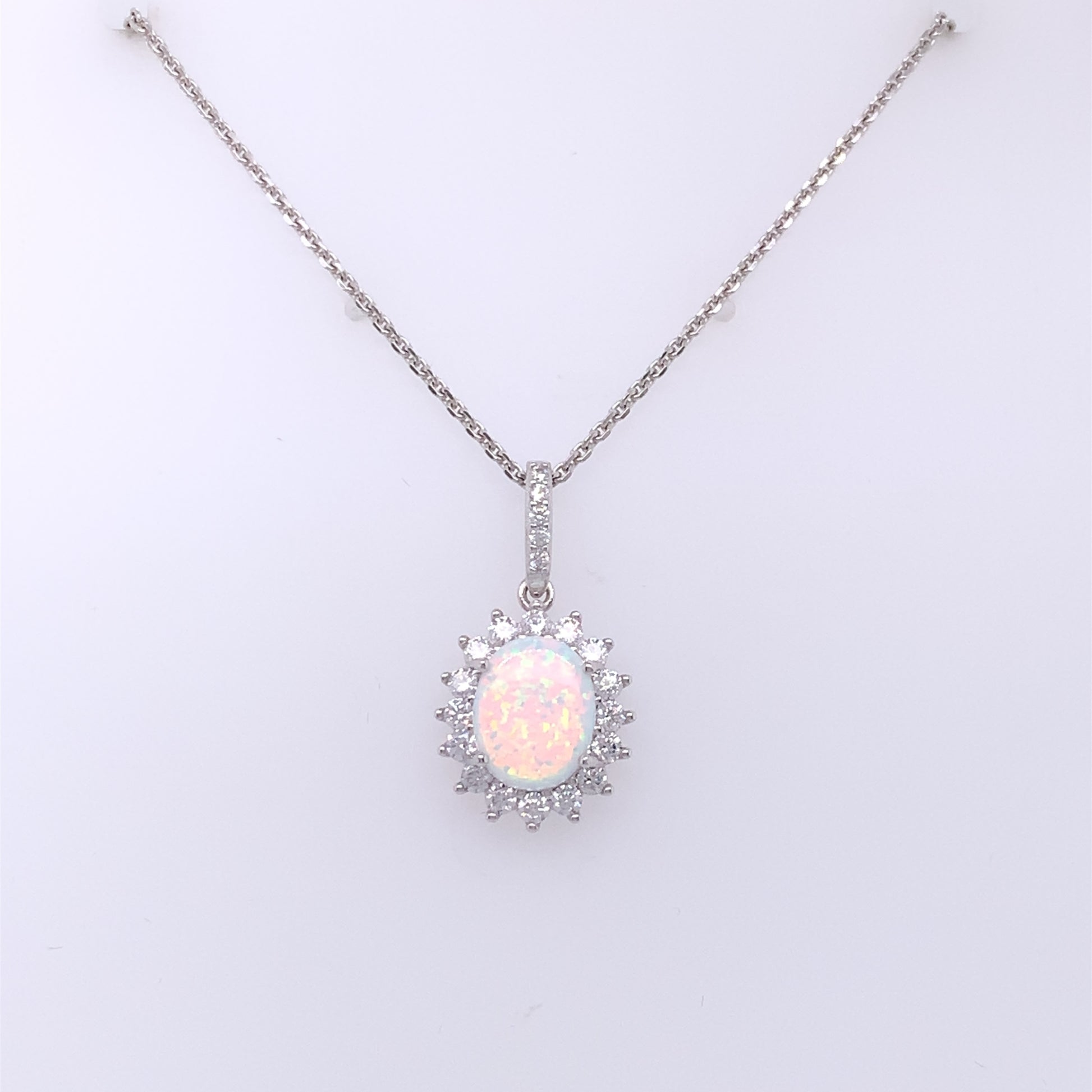 Sterling Silver Syn Opal CZ Oval Cluster Pendant on 18 inch chain