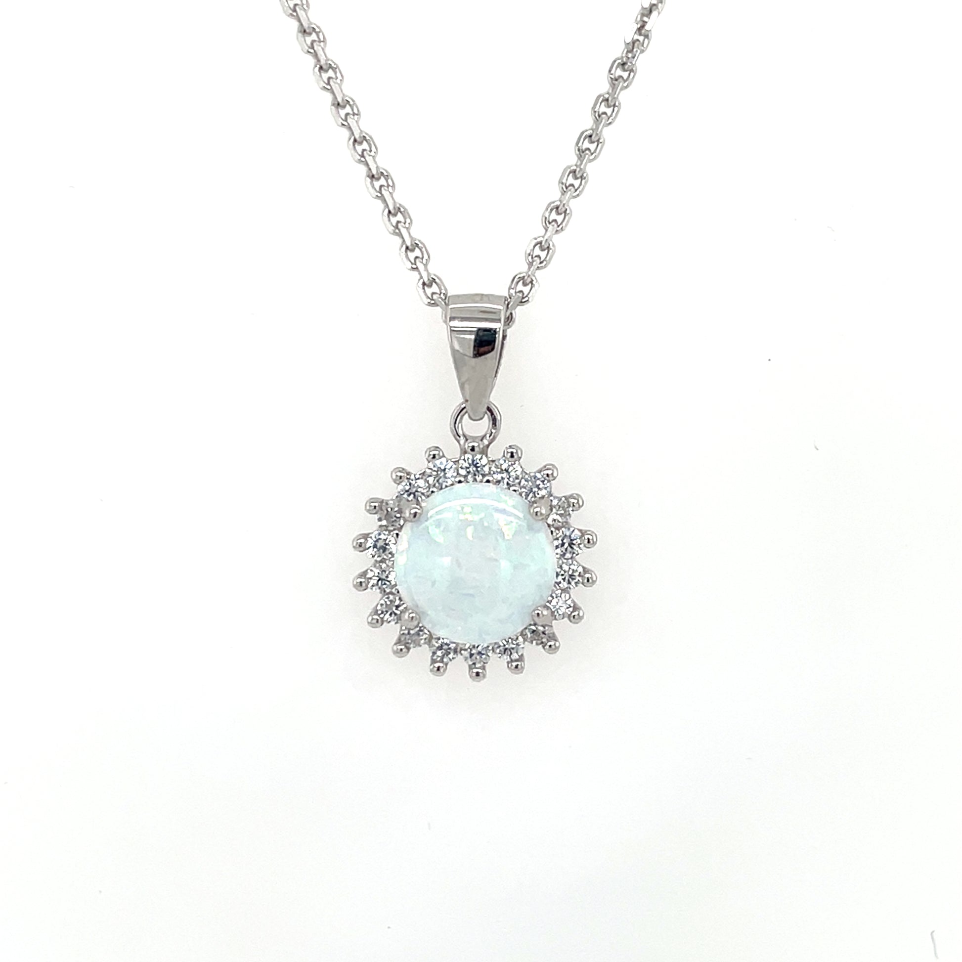 Sterling Silver Opal CZ Pendant on 18 inch chain with matching stud earrings.