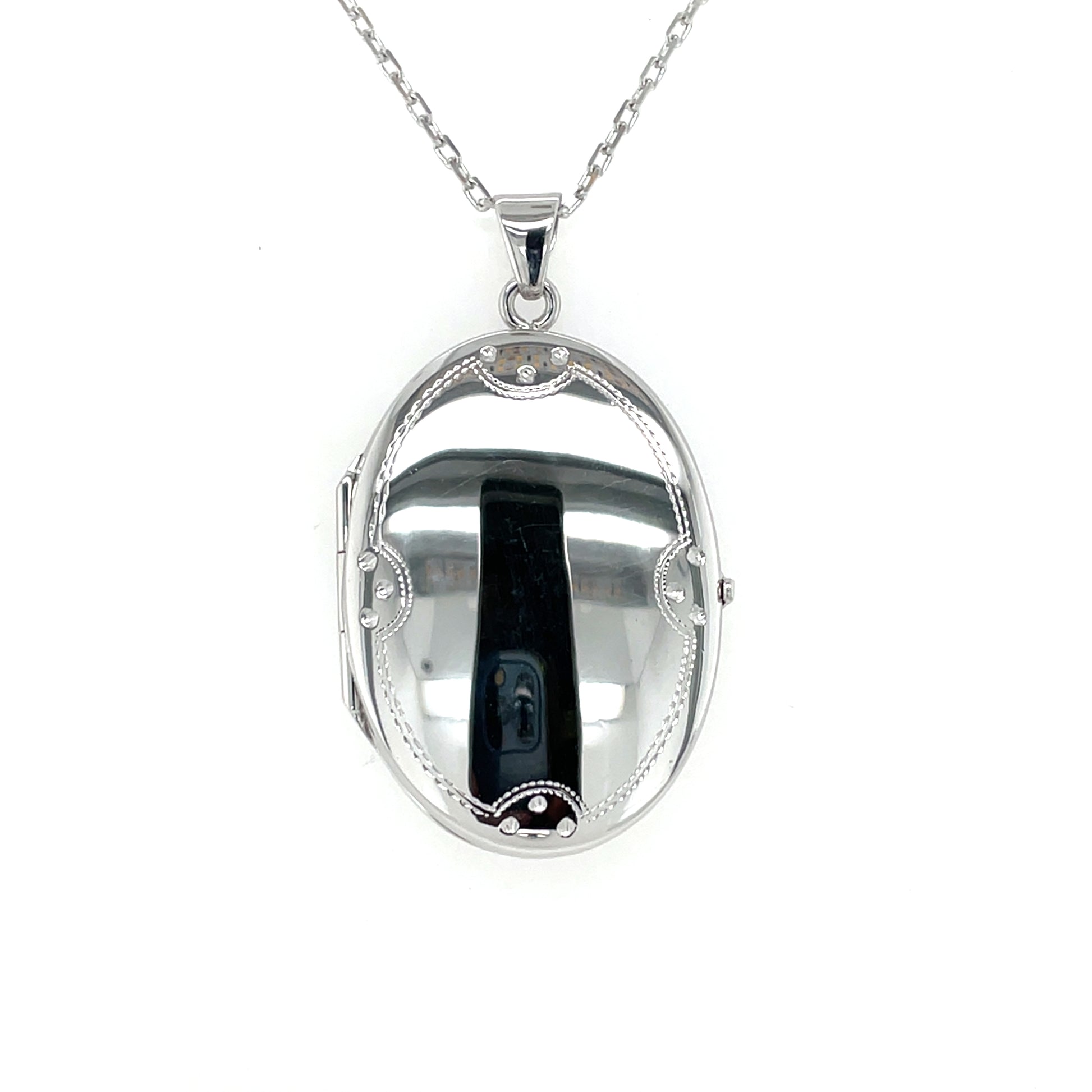 Sterling Silver Oval Engraved Border Locket on 20 inch chain.