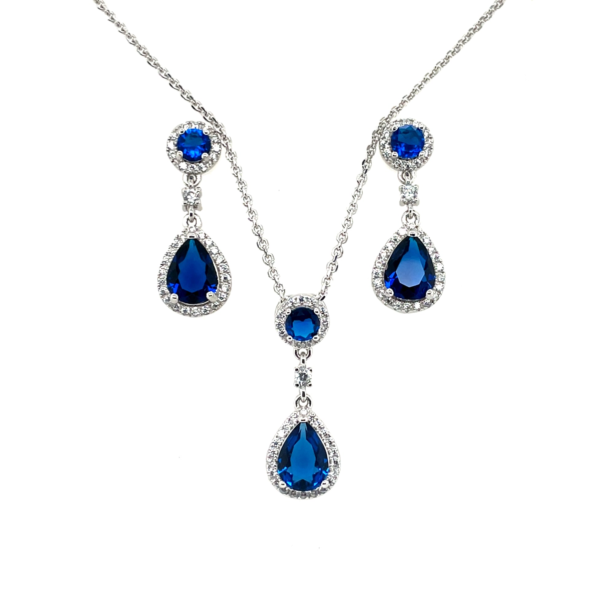 Silver Sapphire CZ Teardrop Halo Pendant on 18 inch chain with matching stud earrings.