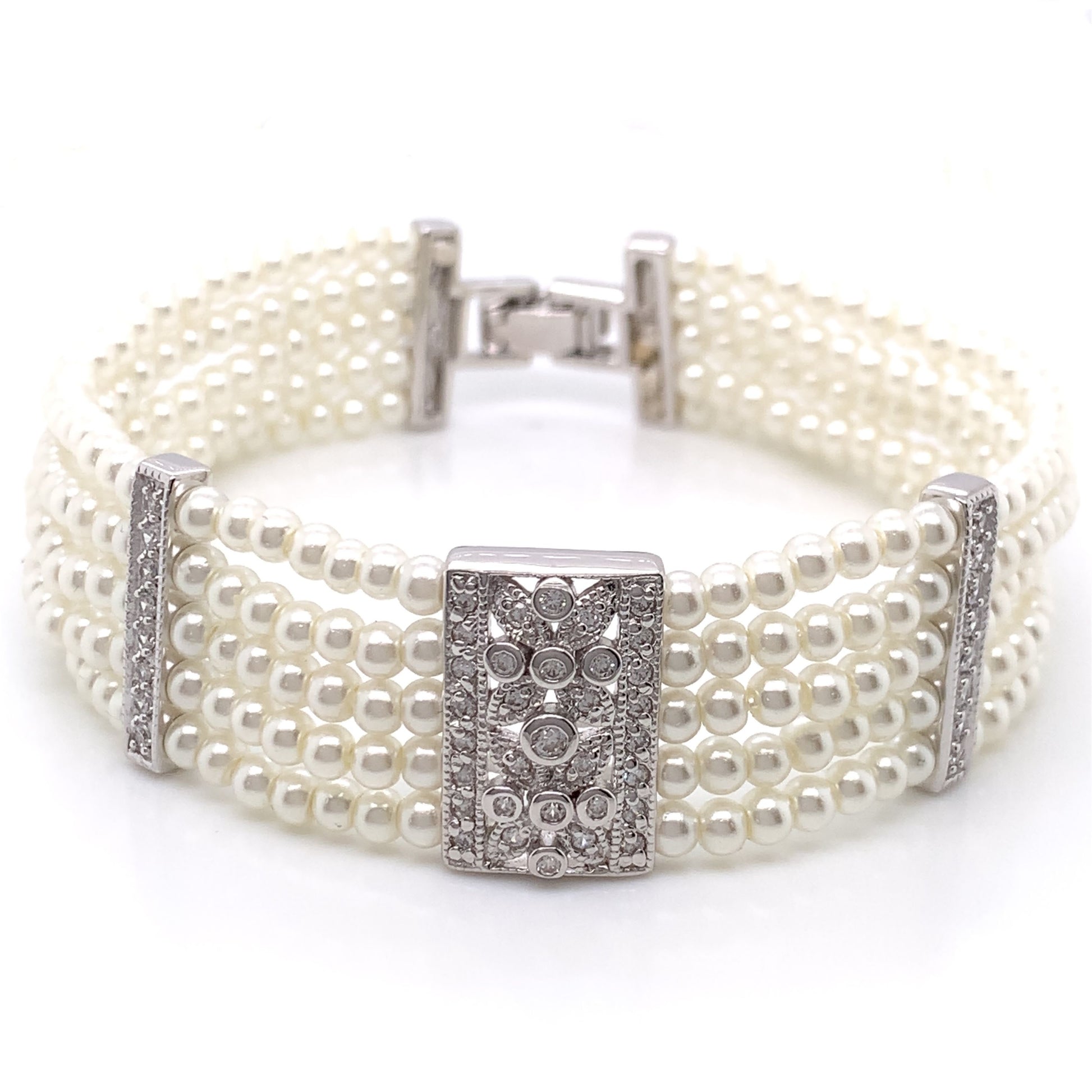 Sterling Silver Vintage Deco Five Strand CZ & Pearl Bracelet.